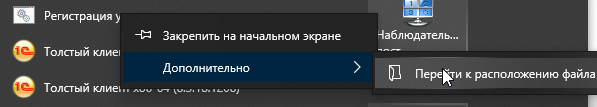 После установки, заходим в Меню пуск раскрыв папку с программой 1С:Предприятие увидим Регистрация утилиты администрирования серверов, правой кнопкой мышки выбираем дополнительно и перейти к расположению файла